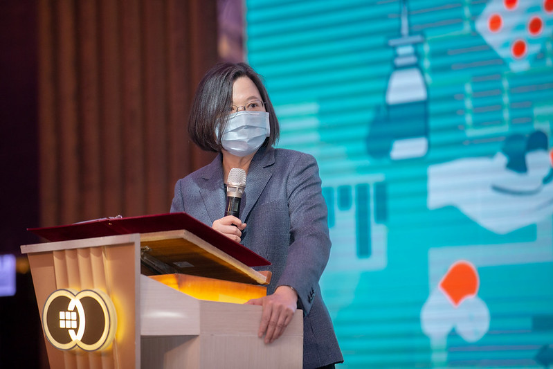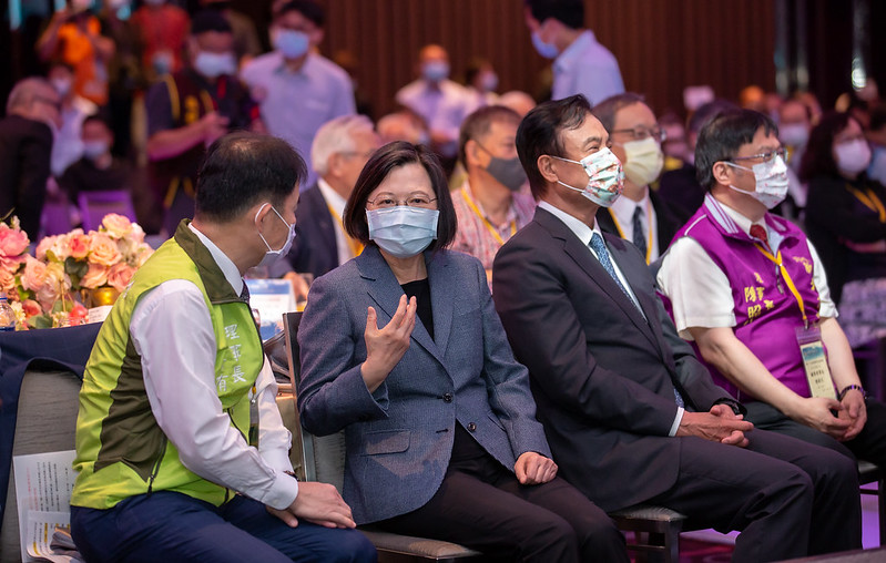 總統致詞時表示,今天現場很熱鬧,有非常多來自各界的好朋友,一起來參加新北市藥師公會的交接典禮。這麼熱鬧的現場,說明了一件事,那就是大家都很感謝辛苦的藥師,這一年多來,幫忙守住了疫情的防線。