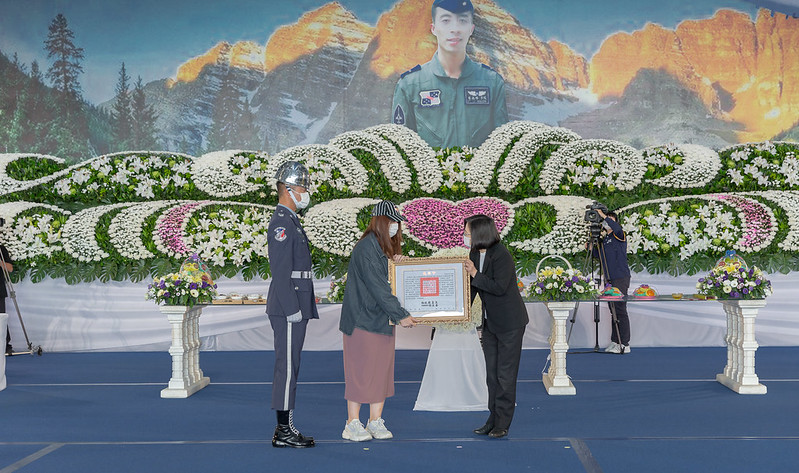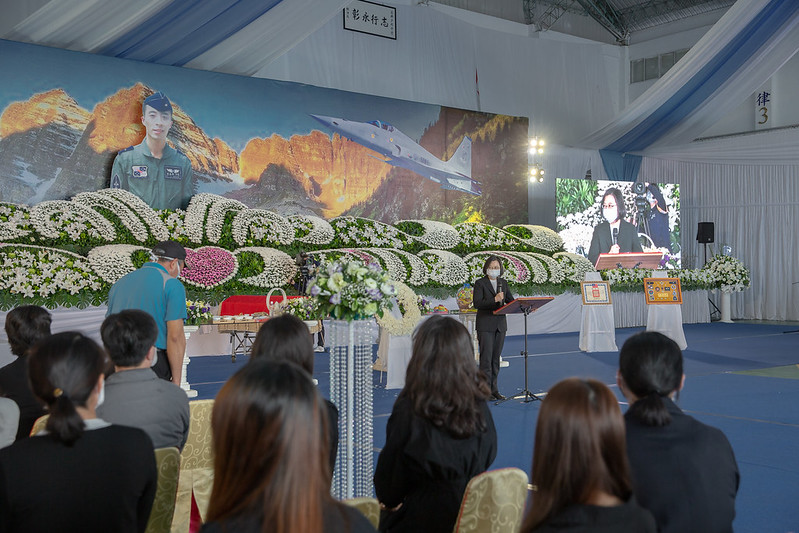 總統提到,她看到尚樺的太太秀宇透過社群媒體寫下許多對尚樺的思念,還有同袍在追思牆留言,「放心,剩下的事,我們扛」。總統強調,剩下的事,我們會一起來做好。她要請國防部一定要全力協助家屬,代替尚樺照顧好家人。她也要請所有的國軍弟兄姊妹務必打起精神、堅守崗位,將尚樺的精神延續下去,「我們一起代替尚樺,捍衛領空、守護我們的國家」。