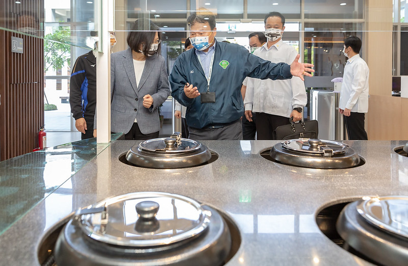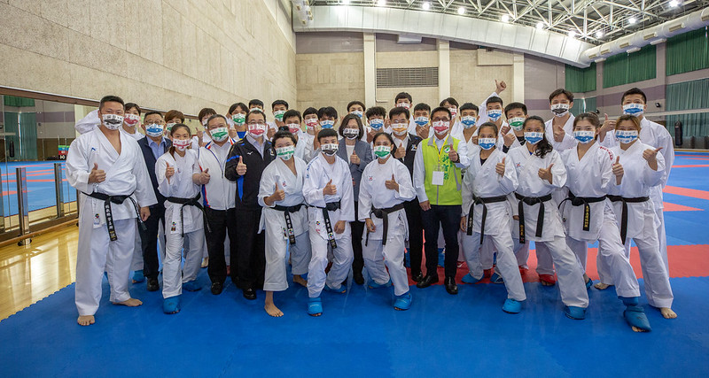 接著,在國訓中心李文彬執行長的導覽下,總統實地參觀新建的餐廳、宿舍及三溫暖等休閒空間,並聽取體育署張少熙署長備戰簡報。總統也接續前往體操場、羽球場、桌球場、空手道場、拳擊場、跆拳道場及田徑場,親自為選手們加油打氣並合影留念。