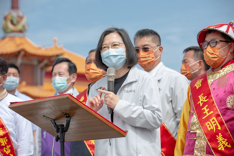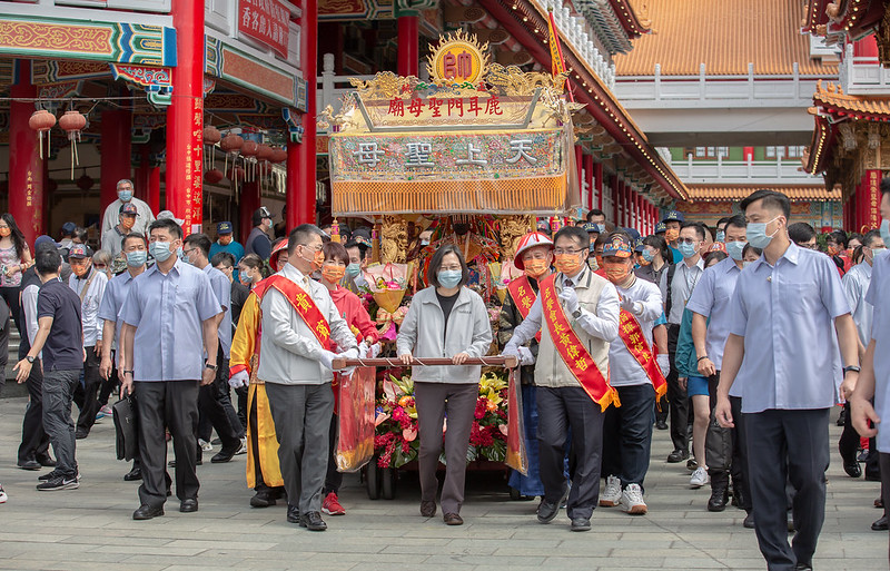 總統表示,她很高興看到大家一起來參與媽祖出巡的活動,她也希望媽祖娘娘慈悲為懷,一定會保佑臺灣人民,讓臺灣社會團結,一起度過疫情及水情的難關。