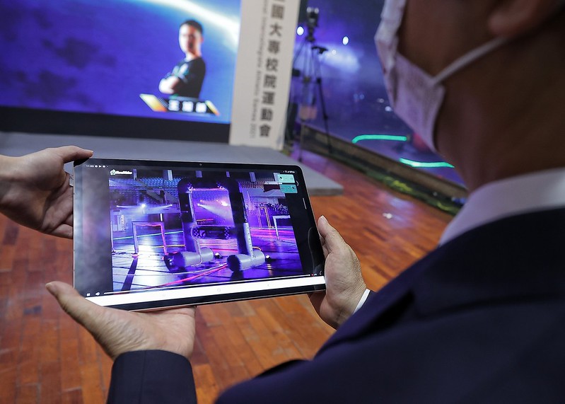 隨後,副總統也透過平板螢幕觀看選手現場進行競速無人機展演,對各界推動電子運動發展、建置智慧場館的努力,表達高度肯定之意。