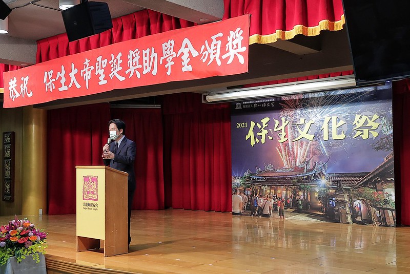 賴清德副總統今(2)日上午前往大龍峒保安宮出席「2021保生文化祭獎助學金頒獎典禮」,肯定保安宮作為信仰中心,長期對於公益慈善與藝文活動不遺餘力的付出;也勉勵獲獎同學們秉持保安宮濟世助人的精神,能夠回饋社會,持續善的力量。
