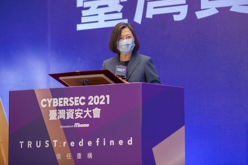 蔡英文總統今(4)日上午出席「2021臺灣資安大會開幕典禮」時表示,臺灣位於民主前緣,不只是國際上數一數二的資安攻防熱區,更是第一線的練兵場,大家要一起把挑戰轉化成機會,與理念相近國際夥伴共創網際空間繁榮,並發展臺灣獨特的優勢。政府會持續強化組織、落實法制、培養人才、支持產業,她也期待政府及民間資安領域的先進、好朋友,都可以攜手打拚,共同建立「堅韌、安全、可信賴的智慧國家」。