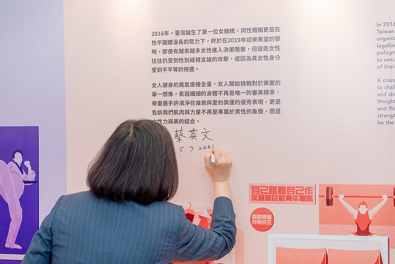 總統抵達後,首先由婦女權益促進發展基金會黃鈴翔副執行長導覽參觀台灣國家婦女館,並在臺灣婦權發展歷程紀念板上留下簽名。