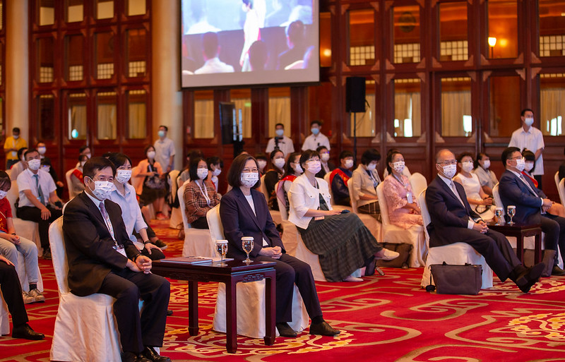 隨後,總統一一頒獎予獲獎同學。「2021總統教育獎」得獎同學包括國小組:豐恩騏、毋巧翊、塗煜鈞、鄧妍玲、陳柔安、江洛苡、陳翰、黎哲銓、王棱卉、全子宇、陳敏如、楊意訢、巫岳龍、李沛玹、吳慕安、樂可艾‧法拉屋樂、羅瑜柔、洪英珊等18名;國中組:林耕鴻、胡玲瑜、藍睿瑜、楊季湄、危宇澤、林昕穎、陳秉彥、施言道、林詩閔、曾品育、黃宜甄、林千祐、郭台銘、章雅芳、黃佑生、蘇嘉軒、陳俊翊、劉祐呈等18名;高中職組:陳宇、王博右、嚴泰棣、徐瑋佑、吳耀忠、陳靜儀、曹靜茹、蔡傑、吳純甄、邱瀞儀、張博雅、徐唯嘗等12名;大專組:曾琬瑜、劉育琛、黃瀚勳、李欣恬、林亞璇、康文賢、廖惠玲、張依婷等8名。