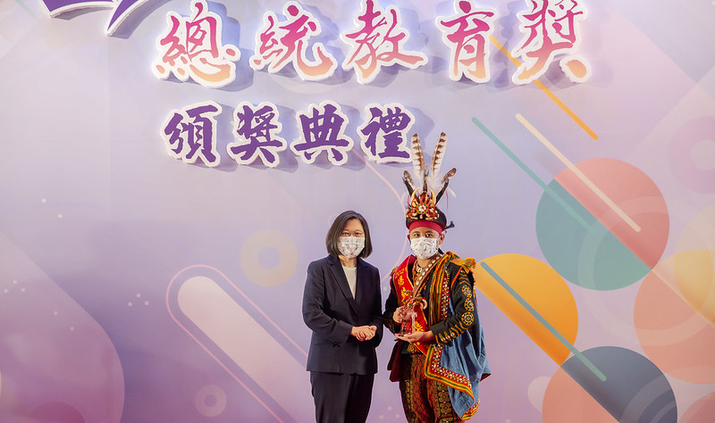 總統接著說,屏東縣泰武國小的樂可艾‧法拉屋樂同學,參加古謠傳唱隊,為了了解演唱的內容,主動跟80歲vuvu(排灣族語:祖父母與孫子女輩的互稱)學習,後來也通過排灣族語中級認證,更代表臺灣出國演出,讓更多人知道排灣族的文化。此外,樂可艾同學的父親查馬克,也是最近知名戲劇《斯卡羅》的主角。