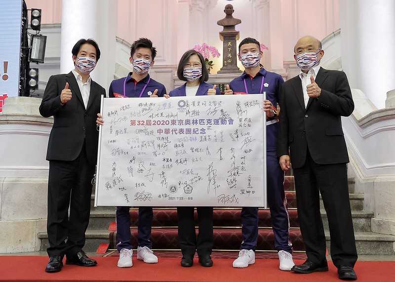 最後,府前廣場由陸軍特戰隊員排列「TW」字樣隊形,展開巨幅國旗,總統、副總統及與代表團成員一起與國旗合影,再次感謝所有台灣英雄的付出,讓世界透過東京奧運,再次看見台灣。