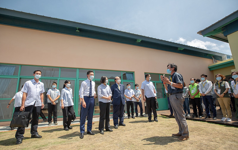 隨後,總統在建築師陳永興的導覽下,巡禮園區遊戲室外窗檯、沙坑、戶外劇場及教室等。