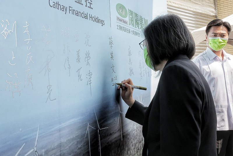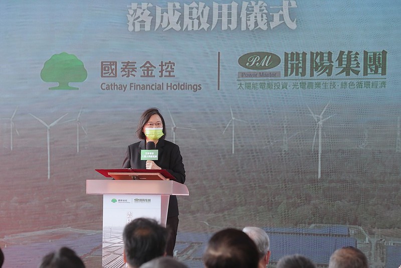 總統說,今天很高興看到除了光電產業以外,還有金融業國泰金控、國泰人壽大力支持綠能產業的發展。政府在去年啟動「綠色金融行動方案2.0」,就是期盼金融機構共同支持能源轉型,創造更永續的發展。