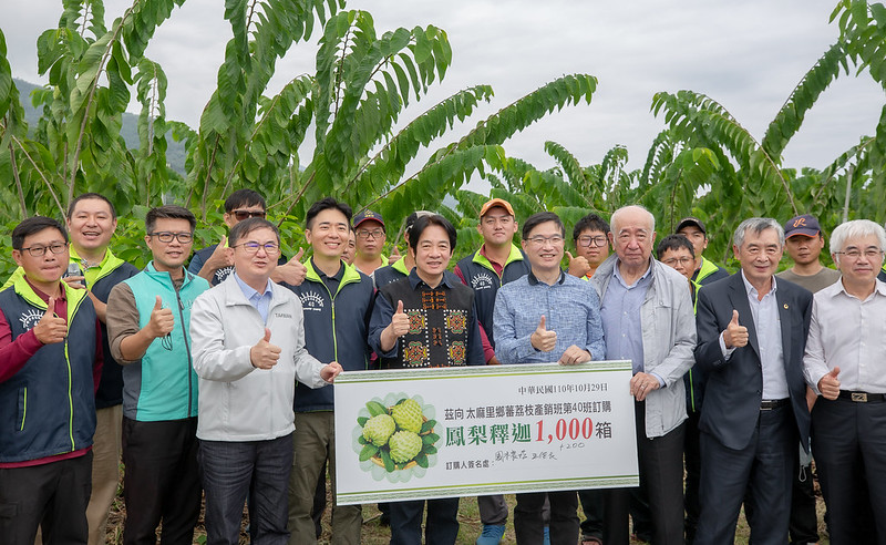 副總統致詞時表示,臺灣釋迦最近遭遇中國暫停進口,因此他今天邀請企業界朋友來到臺東鳳梨釋迦產地,要用具體行動向農民朋友表達支持,相信接下來會有越來越多人來支持與購買,和所有農民站在一起,不會讓大家孤單。