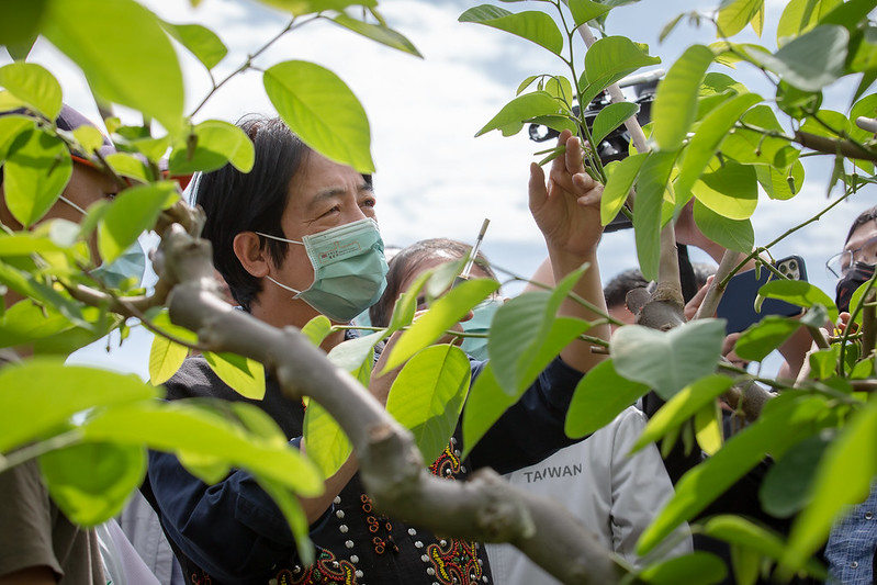 副總統先後抵達卑南鄉頂岩灣及太麻里鄉番荔枝產銷班第40班,並聽取鳳梨釋迦果園介紹及體驗套帶及授粉實作。