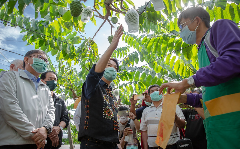 副總統提到,他本身很喜歡吃鳳梨釋迦,過去臺灣最好吃的鳳梨釋迦多數都外銷往中國,藉由這個機會也可以讓臺灣人吃到品質好、營養好的鳳梨釋迦。農民朋友可以將危機作為轉機,建立一個更加多元、長遠的銷售方式,讓品質、價錢都可以顧好。譬如直接宅配到市場或外銷,也可以請科學家協助解決東方果實蠅的問題,讓鳳梨釋迦可以出口到更多國家,又或是加工做成冰淇淋、餅乾及水果口味啤酒等,政府及各界都會一起來幫忙。