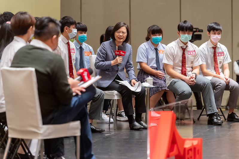 有關學生詢問,近幾年來中共軍機一直來騷擾臺灣,身為高中生的他們該如何去了解這件事情,並要用什麼心態去面對。總統希望,大家都抱持一個態度,我們確實是生活在一個挑戰比較多的國家,或許會因為太多事件發生而擔心,可是我們這個國家從來都不是順風順水,我們在歷史的進程裡面都面對很多困難,但都一一解決。發展到今天,臺灣算是非常好的民主跟自由的經濟。總統認為,從高中同學的角度來看,她會鼓勵大家去進一步了解事件發生的原因,這些軍事的活動所代表的意義,但也希望大家要抱持著一個自信,「我們是有能力保護自己的國家」。
