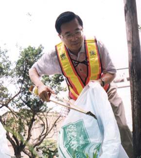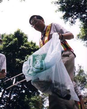 總統在早上九時許,身穿螢光色環保義工背心、手持紙屑夾在寓所附近,沿著重慶南路的安全島撿拾散落在路旁的垃圾,發起「認養台灣」運動的環保義工林明德先生、中華民國青商總會會長王齡嬌女士,以及總統府秘書長游錫堃、中央研究院院長李遠哲,也利用假日共同參與這項社區服務工作。