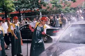 陳總統水扁先生在五月二十日就職滿週年的今天,由總統府秘書長游錫堃及中央研究院院長李遠哲的陪同,擔任社區環保義工及洗車義工,除了體會基層環保人員工作的辛苦外,也身體力行從事社區服務工作,以實際行動,體現志工的精神,落實「志工台灣」的理想。
