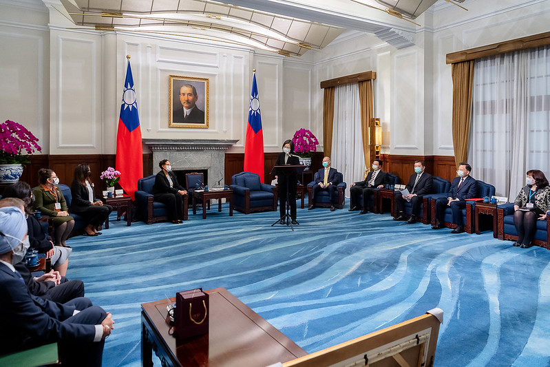 訪賓一行尚包括貝里斯駐臺大使碧坎蒂(Candice Augusta Pitts)、貝里斯國會參眾兩院副書記長珮璩(Clarita Pech)及「美國國際民主協會」亞太區總監安南德(Manpreet Singh Anand),由外交部長吳釗燮陪同,前來總統府晉見總統,總統府秘書長李大維也在座。