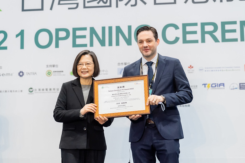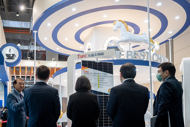 隨後,總統頒發「SEMI臺灣產業貢獻獎」、「優質太陽光電產品金能獎」、「優良太陽光電系統光鐸獎」及「PVGSA再生能源太陽光電發電系統推廣獎」予得獎者及企業;並參觀「哥本哈根基礎建設基金(CIP)」、「URE聯合再生能源」及「TSEC元晶太陽能」等展場攤位,聽取企業廠商產品介紹。