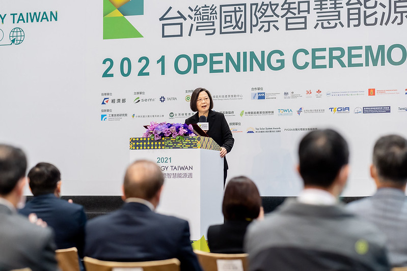 總統致詞時表示,上個月COP26剛落幕,這次大會很重要的焦點就是,「2050淨零排放」已經是全球共識;未來,各國都會努力推動減碳工作。能源轉型是減碳的關鍵,今天「台灣國際智慧能源週」的舉辦,更加展現出臺灣發展再生能源的決心和實力。