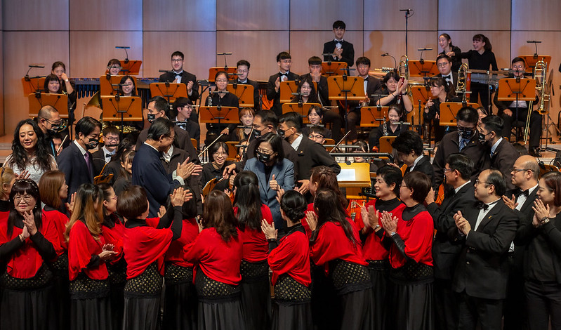 演出結束後,總統及副總統先與觀眾在原座位手持節目冊、邀請卡合照,隨後並至後台與演出人員代表交流致意,肯定本次演出精采成功。最後,總統及副總統再度回到演藝廳,與全體演出人員合影留念,為此次音樂會劃下圓滿句點。