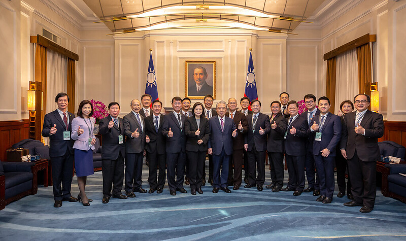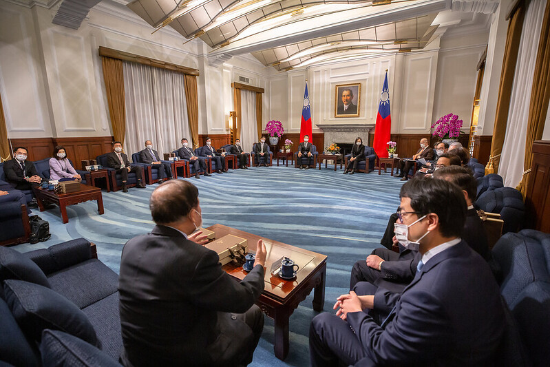 訪賓一行由經濟部次長林全能陪同,前來總統府晉見總統,總統府秘書長李大維也在座。