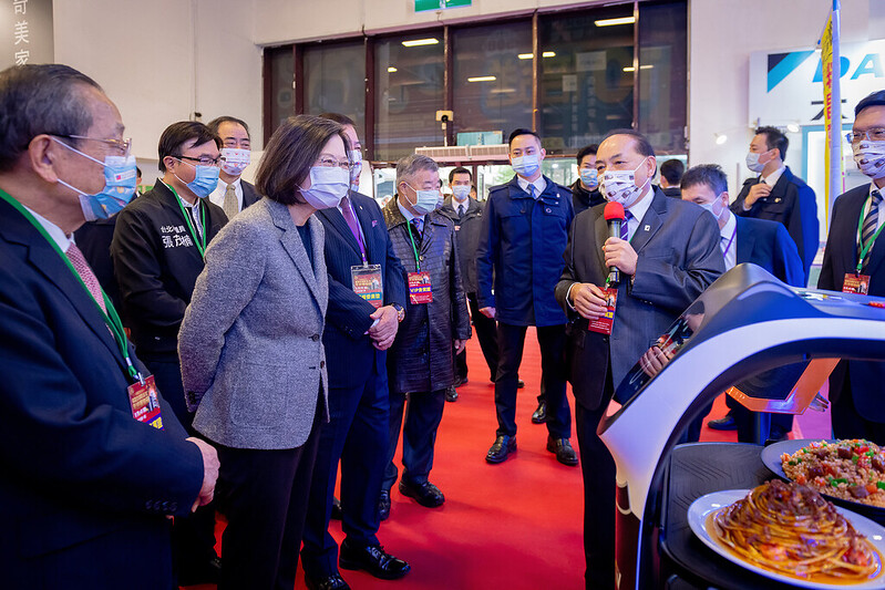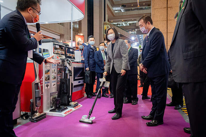 總統表示,以前她來參加展覽時曾提到,家裡要買洗碗機、掃地機器人,還有洗脫烘衣機,叫做「三機救婚姻」,可以讓家庭生活更美滿,因為做家事的時間少了,家人互相陪伴的時間就更多了。