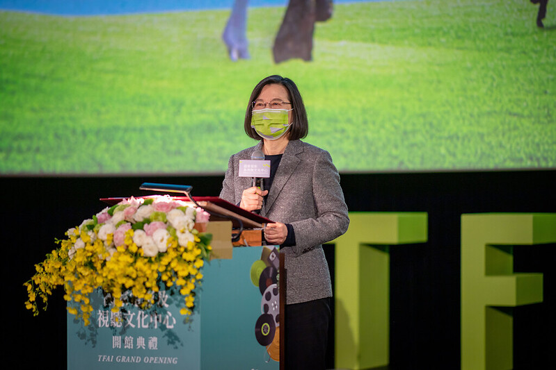 總統抵達後,先觀賞國家影視聽中心發展歷史及形象影片。隨後致詞表示,很高興在2022年的第一週,就能和大家一起來見證「國家電影及視聽文化中心」的開館。過來之前,她特別回想了一下年輕時看過的電影,其中胡金銓導演拍的武俠片《俠女》,令她記憶深刻。這部電影也在影視聽中心努力下,完成數位修復。看到電影的男主角石雋先生今天也在場,真的很開心。