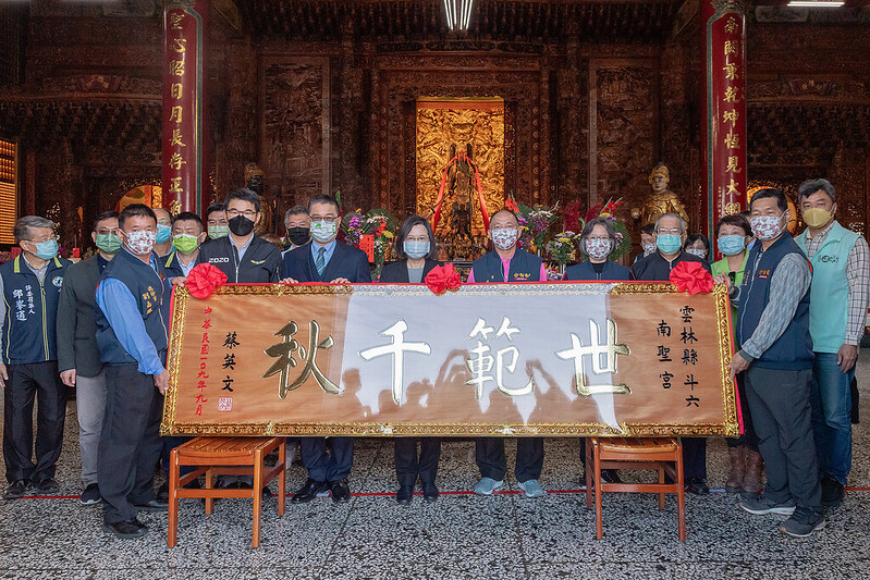 總統抵達「南聖宮」後,首先參香並致贈匾額「世範千秋」,隨後致詞表示,這是她第一次來到南聖宮參拜,感謝南聖宮保佑地方及國家平安。