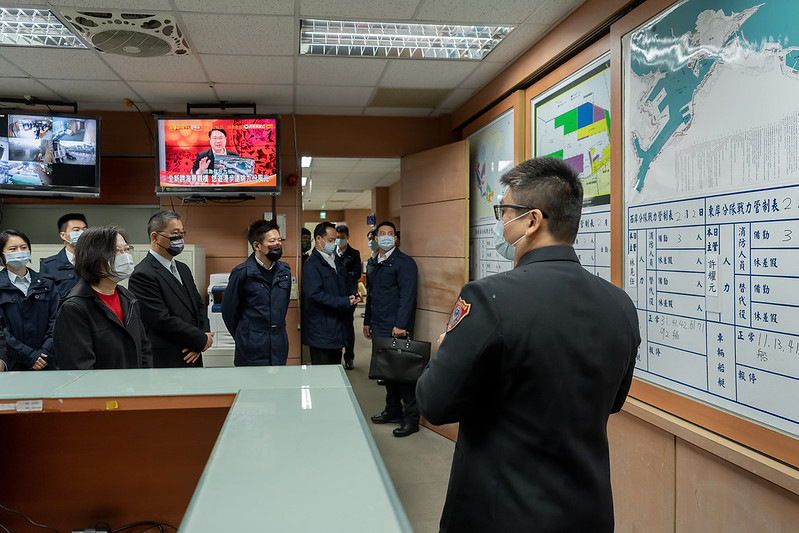 總統抵達後,首先聽取戴國仰隊長「轄區勤務簡報」並視導救災救護指揮中心。