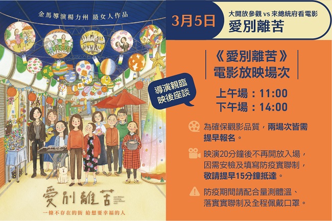 當日上午11時及下午2時於總統府大禮堂特別放映金馬導演楊力州的新紀錄片《愛別離苦》,映後並安排導演現場座談,歡迎大家共襄盛舉,一同享受電影帶來的精采故事與感動。因考量防疫與空間,座位名額有限,額滿為止,有意觀賞者,請自即日起至3月3日(週四)16時止,於總統府官網登記報名(https://www.president.gov.tw/Page/630)。
