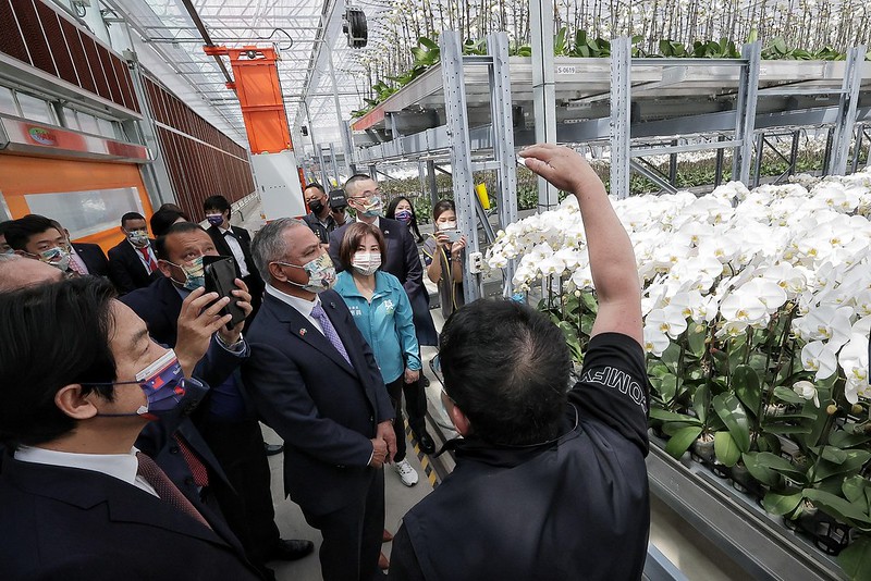 副總統抵達後,首先與訪團聽取臺灣蘭花產銷發展協會人員介紹臺灣蘭花獨特奈米噴染技術,現場並展示烏克蘭國旗上藍下黃顏色的蘭花,表達臺灣對烏克蘭捍衛自由民主的支持;隨後也實地參觀蘭花備貨處理區及自動化溫室作業區,瞭解蘭花的栽培方式。