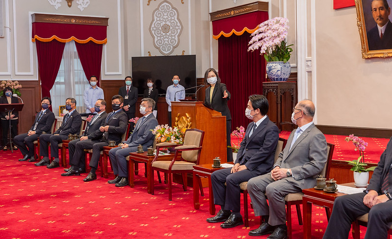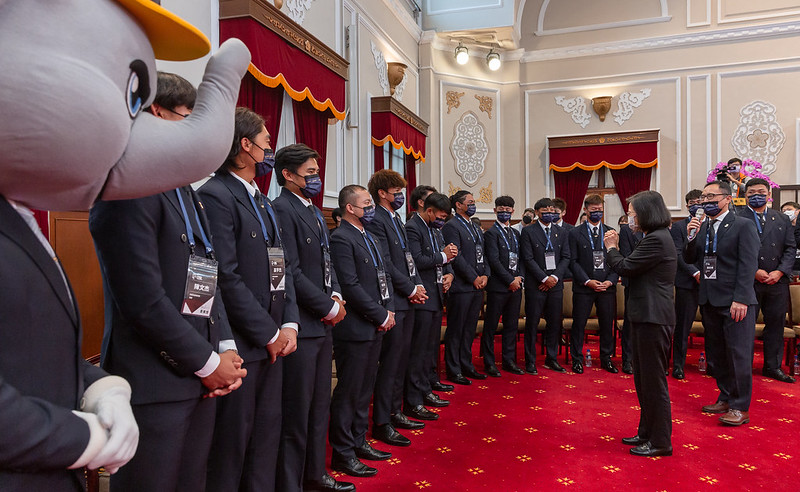 總統致詞時首先歡迎2021年職棒總冠軍中信兄弟來到總統府。她說,中信兄弟是她接見過的第三支職棒總冠軍隊伍,「這次終於等到你們啦」!這也說明了臺灣職棒的競爭確實很激烈。去年她曾出席第一場「臺灣大賽」,當時就感受到「黃衫軍」的團結和氣勢,果然,最後四連勝,拿下睽違11年的總冠軍。