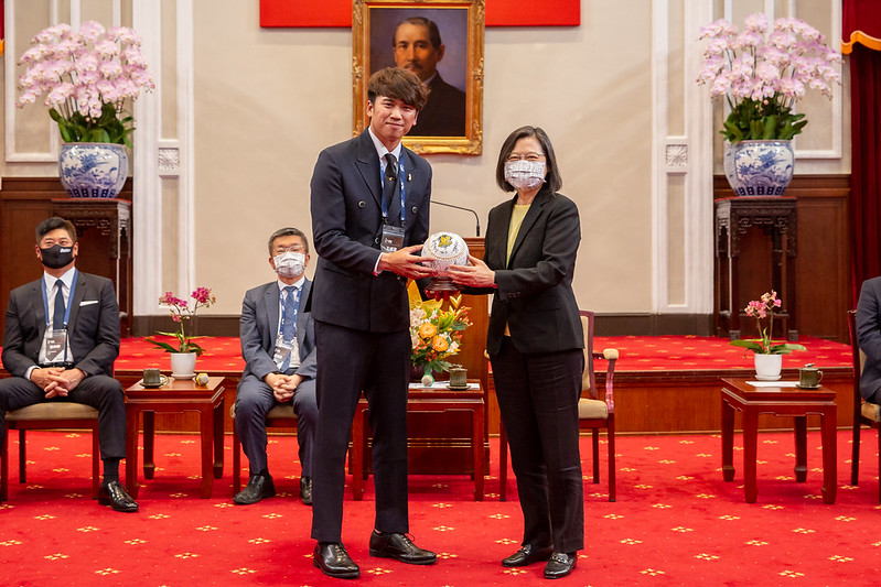總統並恭喜「助總」林威助總教練,第一年帶隊就順利拿下總冠軍。聽說林總教練帶隊嚴謹,非常要求態度,所以有「舉頭三尺有威助」的稱號。稍後她也將聆聽林總教練說明領導團隊的心得。