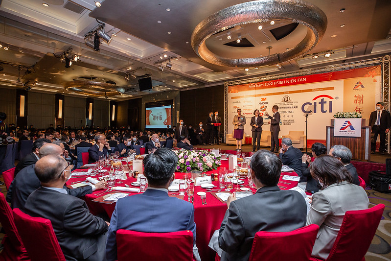 蔡英文總統今(30)日晚間出席「台灣美國商會」(AmCham Taiwan)2022謝年飯,期盼與美國商會持續合作,增進臺美雙邊貿易及投資夥伴關係。她相信,創新務實的合作方式,能使臺美在洽簽雙邊互惠的貿易協定上,取得實質進展。