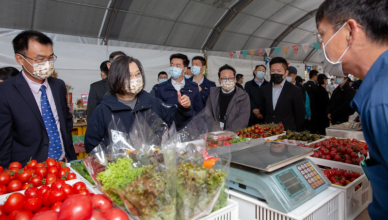 隨後,總統參觀「春日好好市集」攤位,並購買水果玉米、客家麻糬、茶香抱枕、鳳梨、檸檬、地瓜、青江菜、桂圓、米蛋糕、黑豆紫焙桂圓醬、黑豆醬油、香水百合等優質生鮮農產品,以實際行動支持在地攤商。