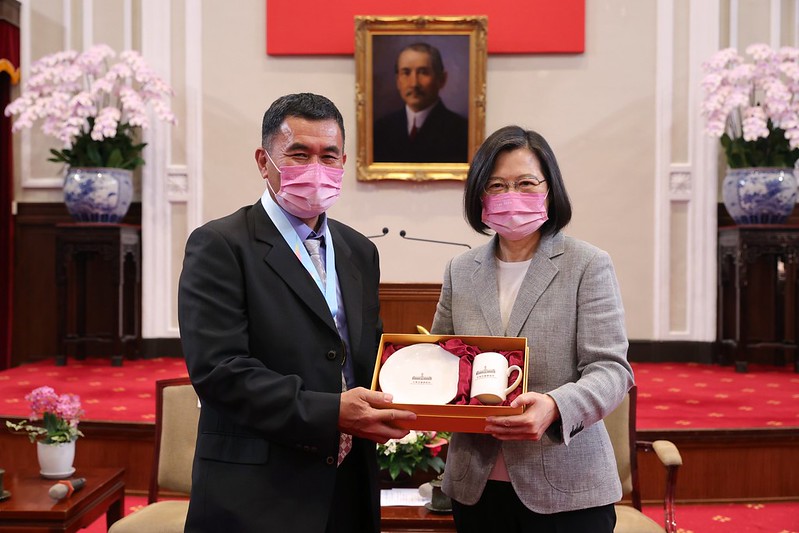 訪賓一行由勞動部長許銘春陪同,前來總統府晉見總統,總統府秘書長李大維也在座。