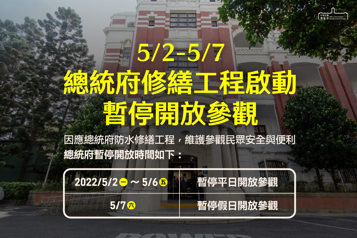 因總統府正在進行內部防水修繕工程,為考量參觀總統府民眾之安全與便利,將自111年5月2日(一)至5月6日(五),暫停平日開放參觀;原訂5月7日(六)之假日開放參觀也將暫停一次。有關往後開放參觀事宜,總統府將視工程進度再行發布,請有意前來總統府參觀的民眾留意後續相關資訊,造成不便,敬請見諒。