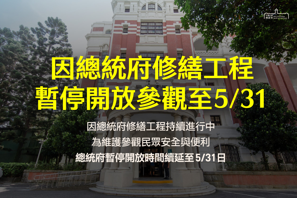 因總統府內部修繕工程持續進行,為維護參觀民眾之安全與便利,總統府將續暫停開放參觀至111年5月31日(二)。有關往後開放參觀事宜,總統府將視情況再行發布,請有意前來總統府參觀的民眾留意後續相關資訊。造成不便,敬請見諒。