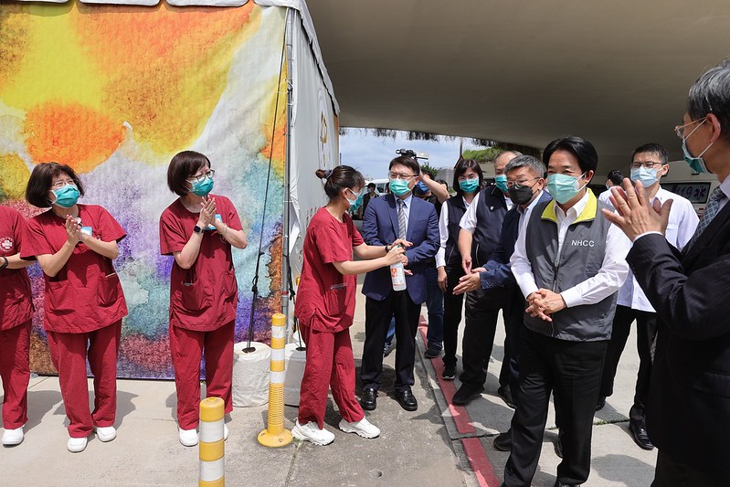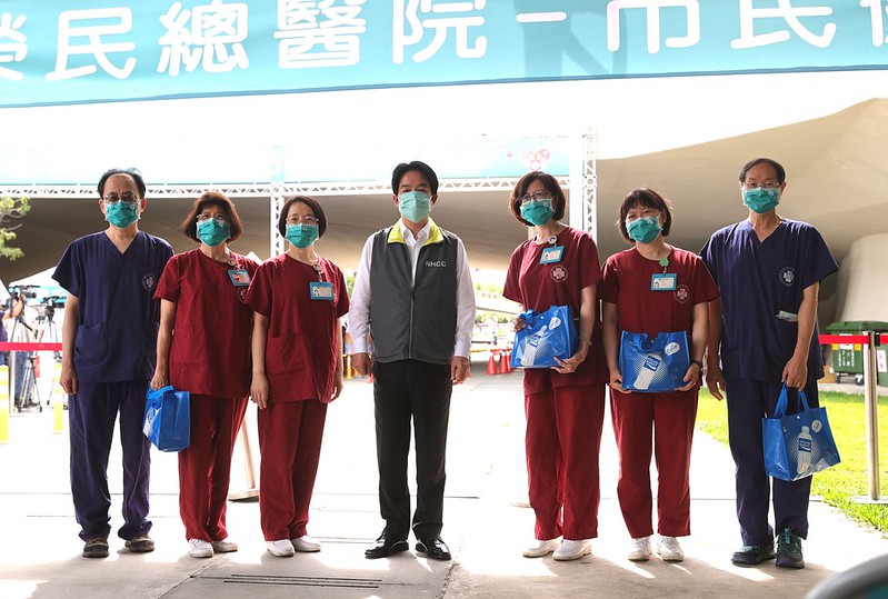 副總統特別感謝醫護人員的共體時艱,身為醫界的一份子,他為這次全臺灣醫療體系的所有醫療同仁表現感到光榮。因為防疫視同作戰,真正戰爭來臨的時候,保家衛國的是國軍;疫情來的時候,保護民眾健康的就是醫療人員。這一次全臺灣的醫療同仁,大家都齊心一致,他相信防疫過後,社會都會給予肯定,每一個醫護同仁的肩上都值得配戴一枚勳章。