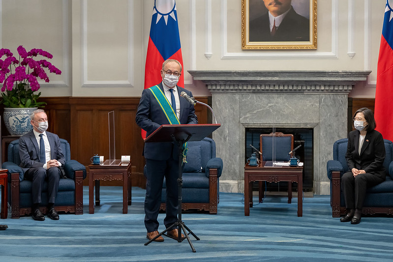 蔡英文總統今(9)日上午頒授法國參議院外交暨國防委員會副主席葛里歐(Joël Guerriau)「大綬卿雲勳章」,表彰他為臺法關係的努力和貢獻。總統也感謝法國在「世界衛生大會」(WHA)為臺灣發聲,展現出力挺臺灣的情誼,並期盼未來,臺灣和法國能在各個領域持續深化合作,加速推動臺灣和歐盟洽簽「雙邊投資協定」(BIA),共同打造具有韌性的供應鏈體系。