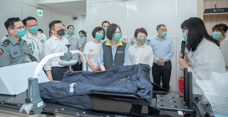 總統抵達後,首先聽取國軍臺中總醫院院長洪恭誠簡報「國軍臺中總醫院任務報告」,並透過視訊連線方式,與該院戰疫複合式醫療站、專責病房、西莒衛生所的第一線醫護人員加油打氣,感謝他們在疫情期間的辛勞與付出。隨後,總統視察放射治療中心了解「IGRT影像導航螺旋放射治療機」的運作及診療方式;接著頒發加菜金,感謝國軍弟兄姊妹的辛勞付出。
