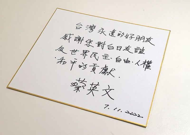 總統進一步表示,這些年來,不論臺灣遇到震災或是疫情挑戰,安倍前首相總是伸出援手;在國際場域,他也為臺灣仗義執言,積極支持臺灣的國際參與。安倍前首相對臺灣的友好和溫暖,將會永遠留在我們的心中。