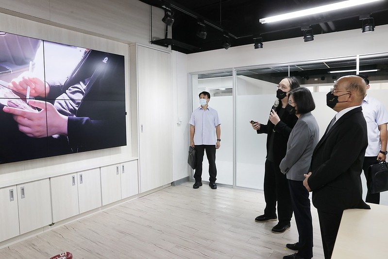 隨後,總統與現場貴賓一同進行揭牌儀式,並在唐鳳部長導覽介紹下,參觀數位發展部辦公空間,瞭解同仁工作情形。