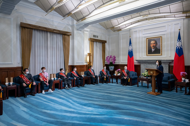 總統提到,還有不少人都認識的吳庚霖(炎亞綸)先生,今天原本要出席,但臨時有事不克前來。他在歌唱和戲劇的成就,大家都有目共睹,在臺灣、星馬和韓國等地,也獲得許多獎項,吸引了不少粉絲。這幾年,一直致力於公益活動,回饋社會,令人敬佩。身為消防員的宋明哲先生,憑一己之力,讓臺灣研發的消防救援裝備,獲得肯定、走出國際,也讓臺灣消防名揚世界。