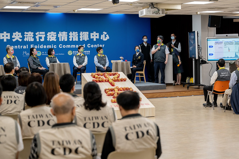 隨後,總統與蘇院長分別致贈現場防疫同仁「平安蘋果」,象徵「千錘百鍊‧平安幸福」。