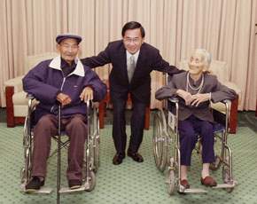 陳總統水扁先生今天特別邀請全國結褵最久、長達八十年的林誥、林鄭漸伉儷和他的家人及村長,到總統府參觀,同時並與他們共進午餐。
