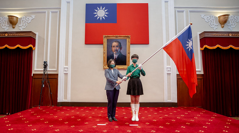 隨後,總統頒授國旗予代表同學汪庭羽,為同學們加油打氣。
