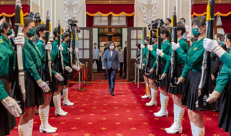 總統到場後,首先接受北一女儀隊同學致敬,並欣賞樂旗隊演出。總統致詞歡迎同學們來到總統府,並表示,北一女樂儀旗隊上次受邀到美國玫瑰花車演出已經是2005年。距離這次,已經有18年的時間,在場的同學可能都還沒出生,能夠參與這次盛會,相信大家都覺得很興奮。