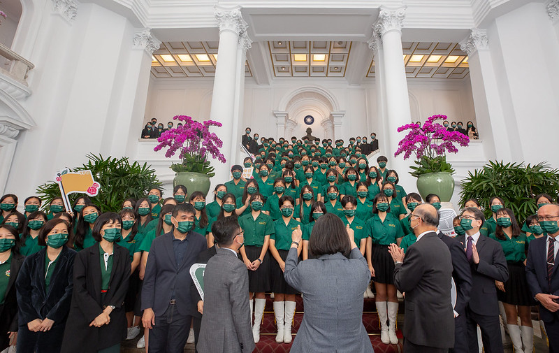 總統說,睽違18年,也代表不是每個總統都有機會為大家授旗。今天,對她來說是難得的機會,很高興可以在同學們演出前,替大家加油打氣。