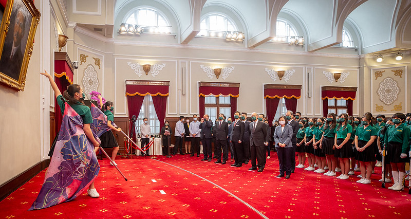 訪賓一行由北一女中校長陳智源率領,僑務委員會委員長童振源、外交部次長蔡明彥、教育部次長林騰蛟、文化總會秘書長李厚慶陪同,前來總統府晉見總統,總統府秘書長李大維也在場。