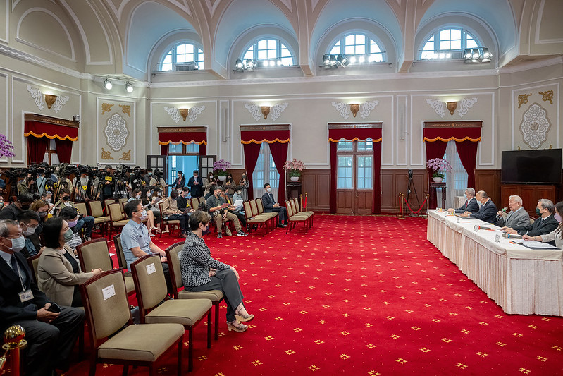 總統府今(21)日上午舉行「2022亞太經濟合作經濟領袖會議代表團」返國記者會,張忠謀領袖代表偕同行政院政務委員鄧振中、政務委員兼國家發展委員會主委龔明鑫、國家安全會議副秘書長徐斯儉及我國APEC資深官員外交部國際組織司司長吳尚年,就本年APEC整體會議情形、資深官員會議與會成果及APEC經濟領袖會議成果等,向國人說明,並接受記者提問。